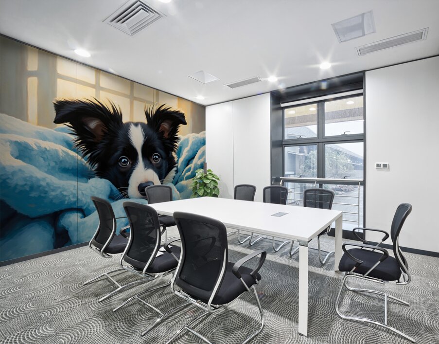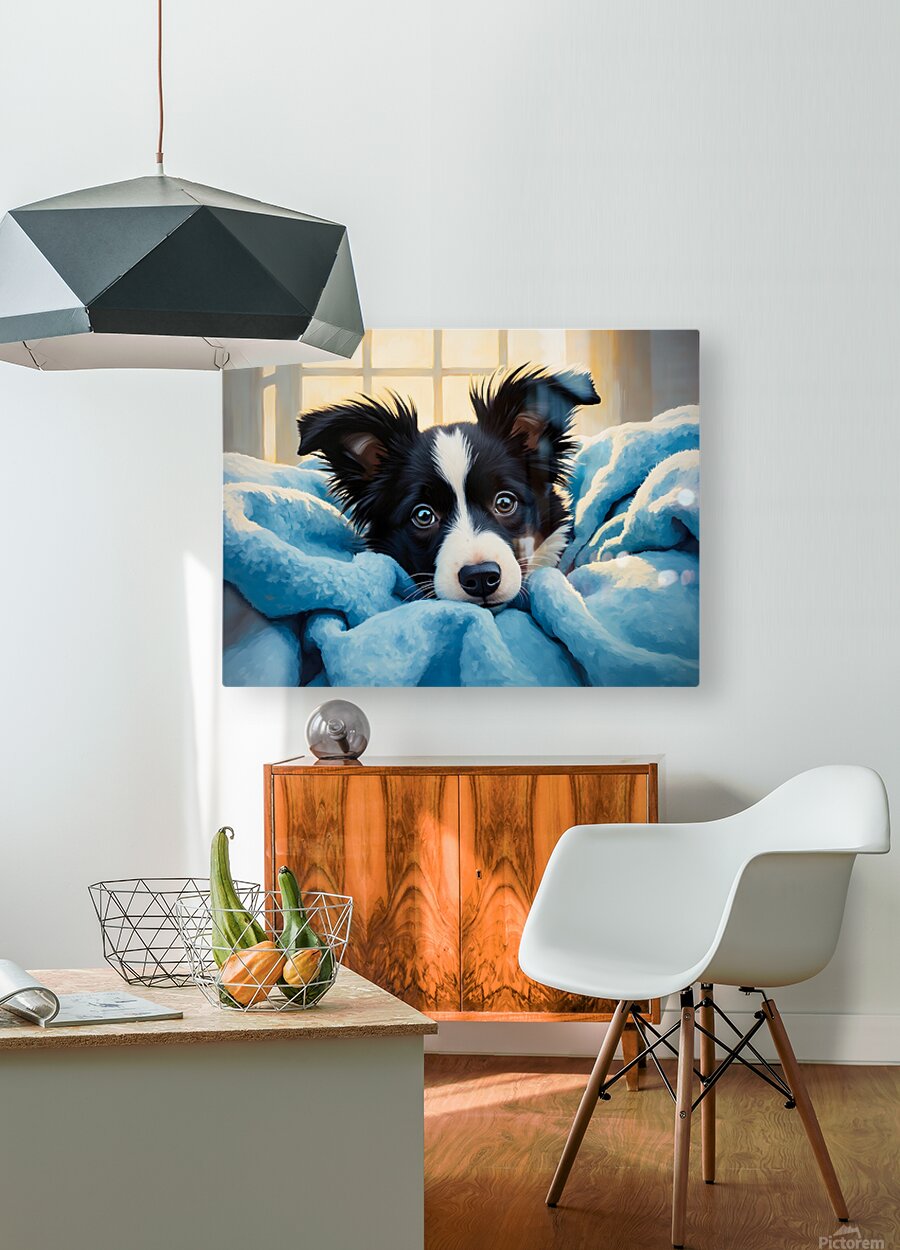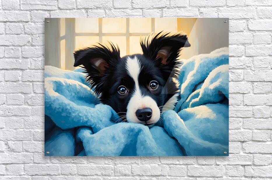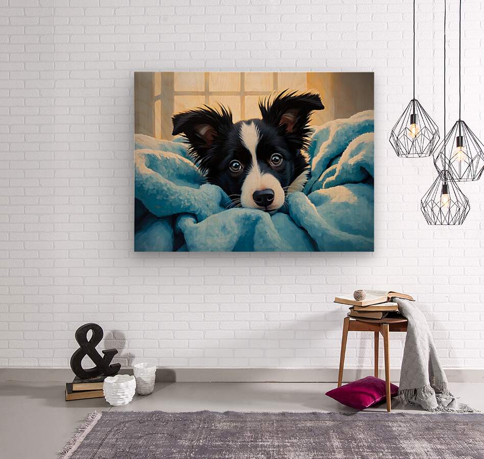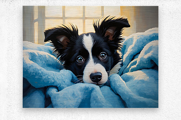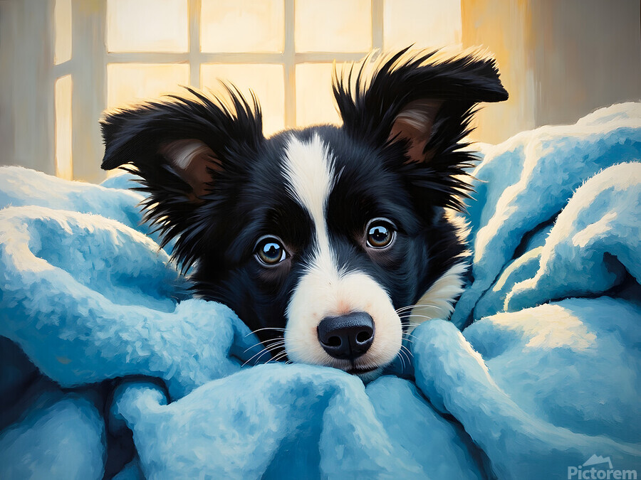 An adorable black and white Border Collie puppy with distinctive markings peeks curiously from beneath a soft blue blanket. The puppys bright eyes and perked ears show excitement as morning light creates a warm inviting atmosphere in the bedroom. Digital Artwork.