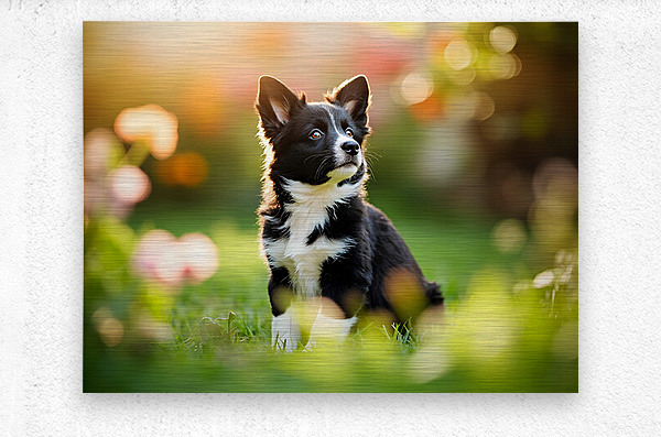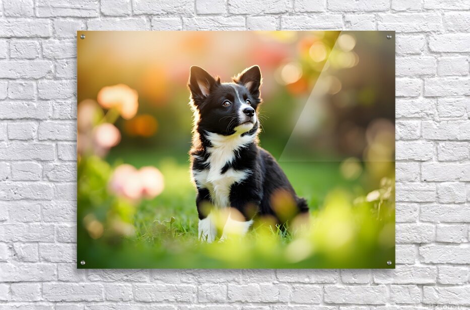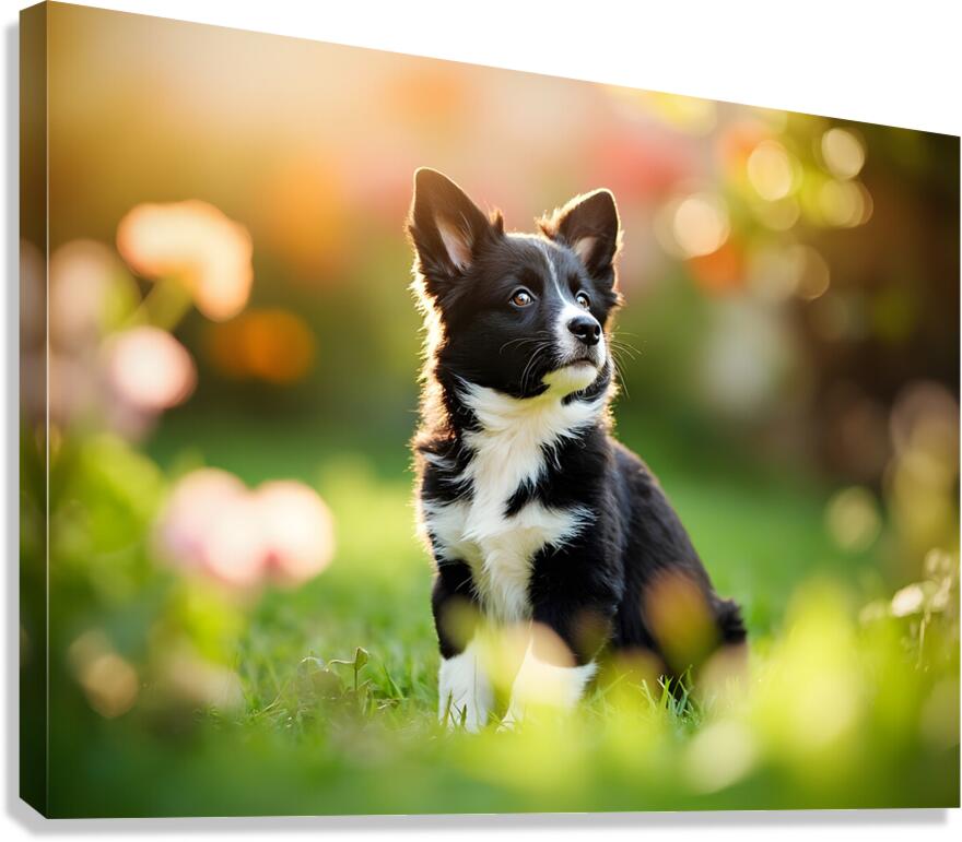 A small black and white Border Collie puppy sits attentively on green grass in a garden setting gazing upward with expectant brown eyes. The young dog displays the breeds characteristic markings with white chest and facial blaze against black fur. Digital Artwork.