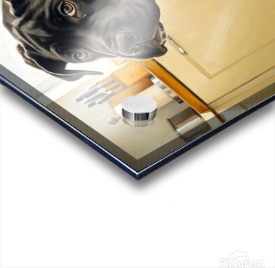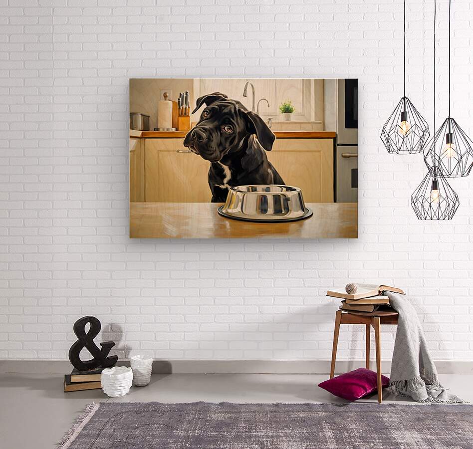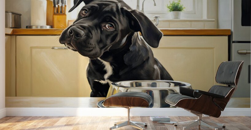 The black Cane Corso puppy sits upright with his head charmingly tilted small ears attempting to perk up as he listens intently for sounds of approaching food time near his metal bowl. Digital Artwork.