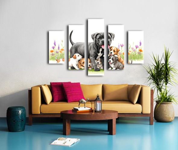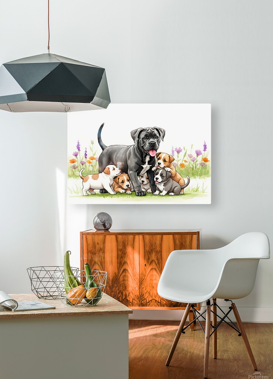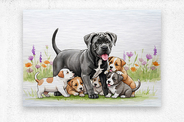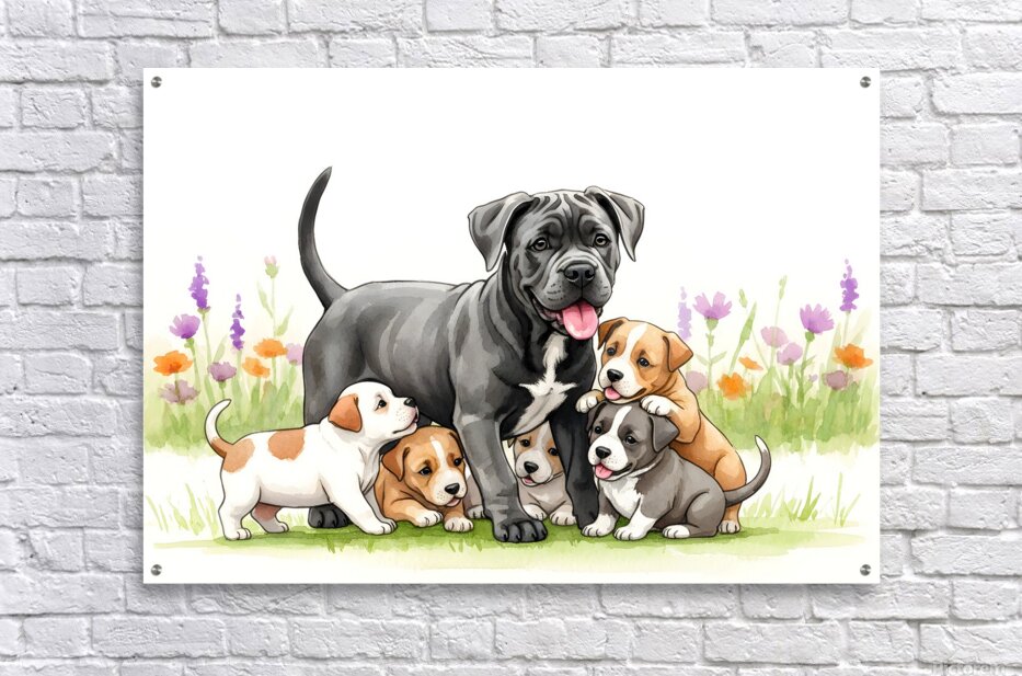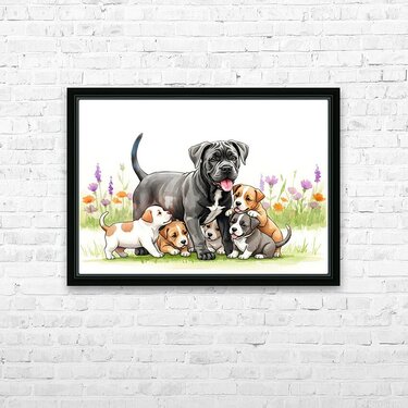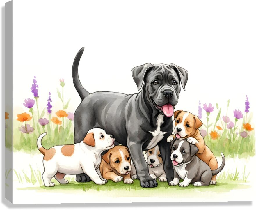 A joyful dark gray Cane Corso puppy laughs and plays as the puppy pyramid dissolves into a delightful heap of wiggling happy puppies among colorful garden blooms Digital Artwork.