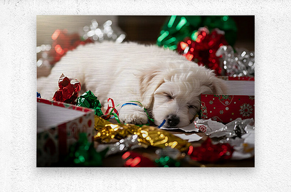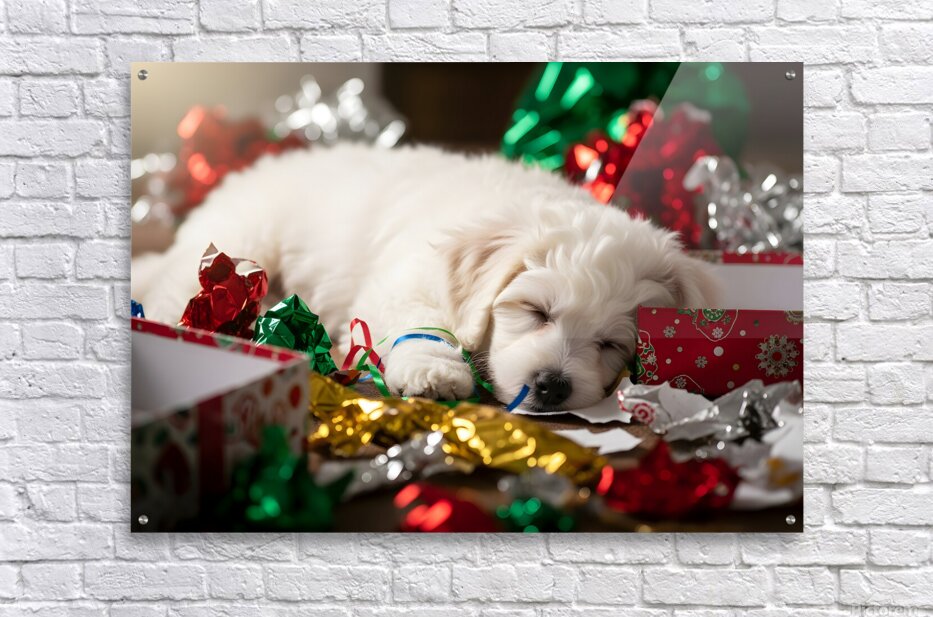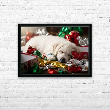 A white Bichon Frise puppy sleeps peacefully curled up among scattered torn wrapping paper and empty gift boxes. The tired fluffy pup rests contentedly on the floor surrounded by the colorful remnants of Christmas morning excitement and play. Digital Artwork.