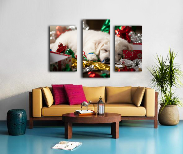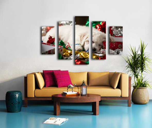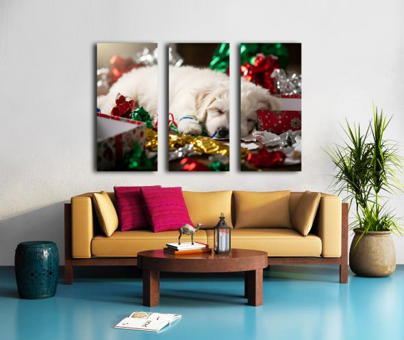 Sleepy Bichon Frise Puppy Naps Among Holiday Wrapping Canvas print