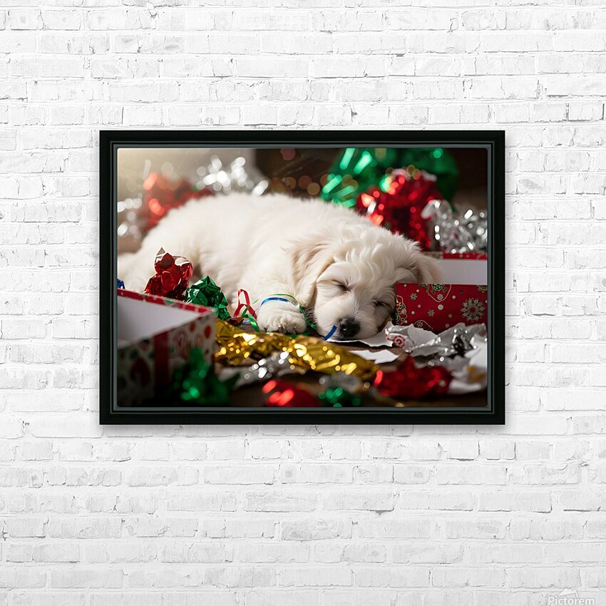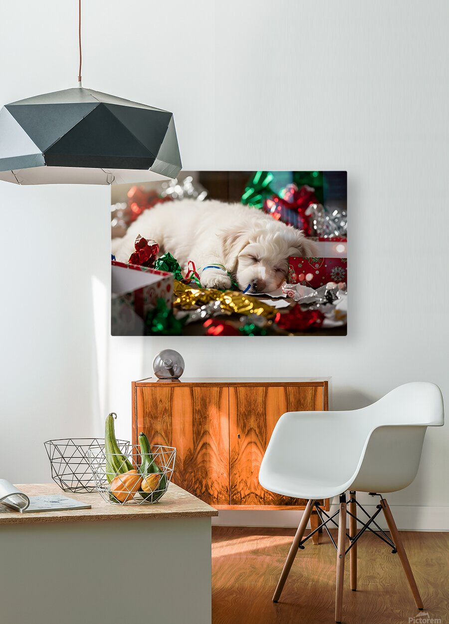 Get this artwork "Sleepy Bichon Frise Puppy Naps Among Holiday Wrapping" in a framed print.