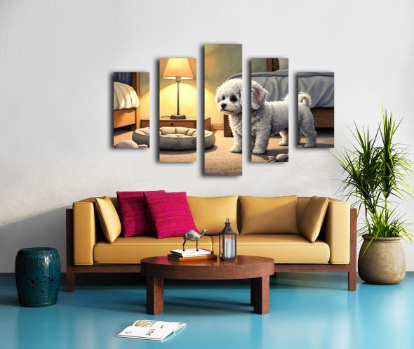 A small white Bichon Frise puppy with fluffy curly coat stands in a warm bedroom gazing at a tiny dog bed placed on soft carpet. The room has gentle lighting and cozy atmosphere. Digital Artwork.