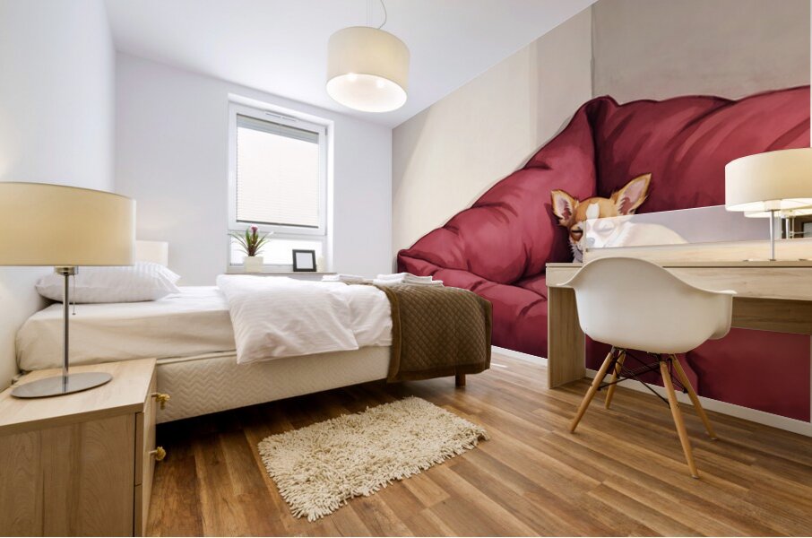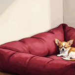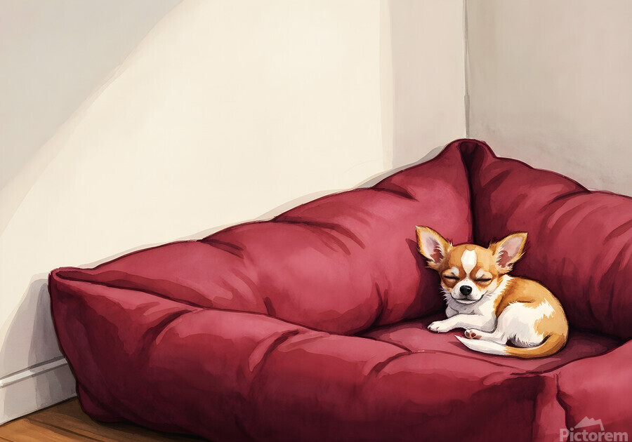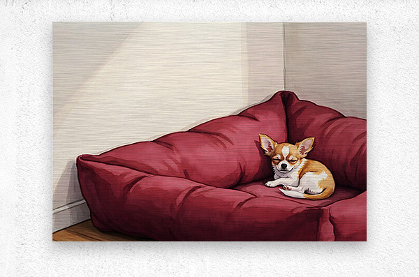 The tiny tan and white Chihuahua puppy curls up peacefully in one corner of the enormous burgundy dog bed. The sleepy puppy looks content despite taking up only a small portion of the massive bed. Digital Artwork.