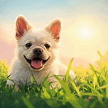 A content cream-colored French Bulldog puppy sits peacefully on green grass with tongue slightly visible showing signs of happy exhaustion after an energetic wrestling session with siblings Digital Artwork.