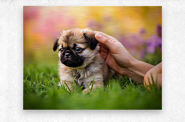 A sweet tan and black pug puppy sits peacefully on green grass while a caring hand reaches down to scratch behind its ear. The little dogs bright eyes show contentment as colorful wildflowers blur softly in the background creating a serene garden setting. Digital Artwork.