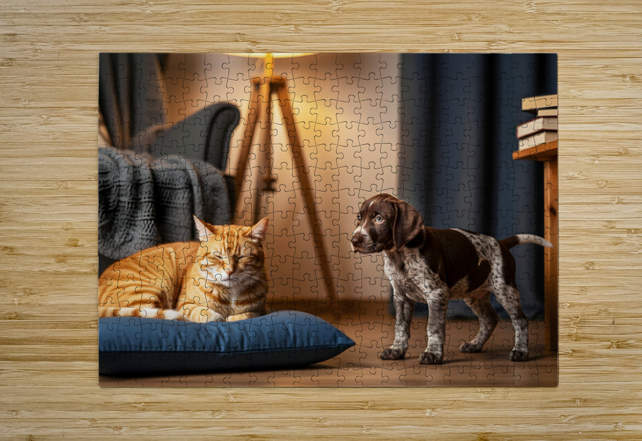 German Shorthaired Pointer Puppy Meets Sleepy Cat Puppy Prints Puzzle printing