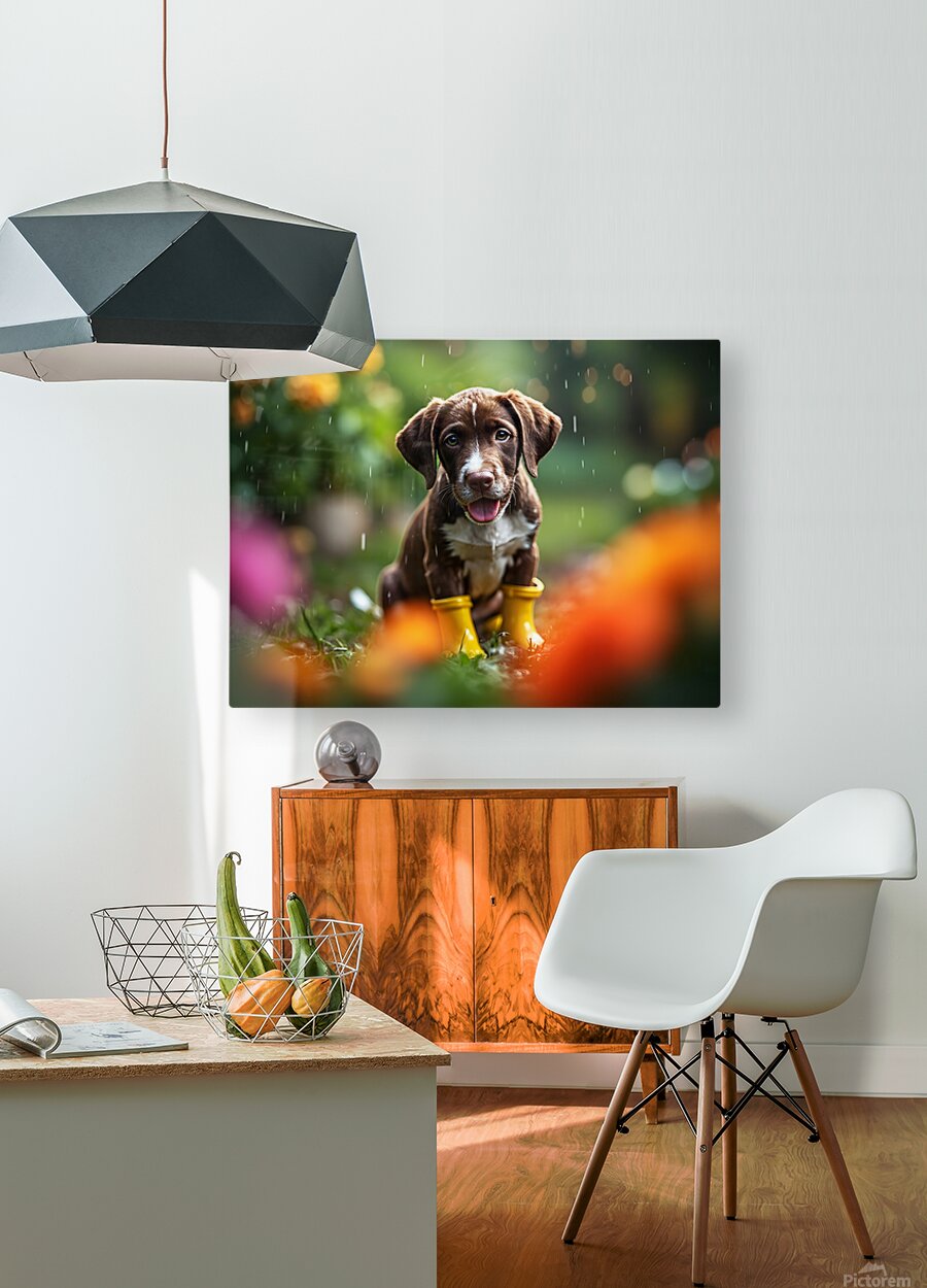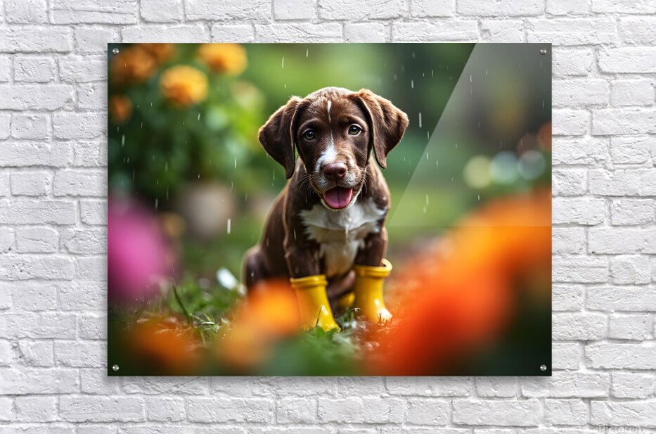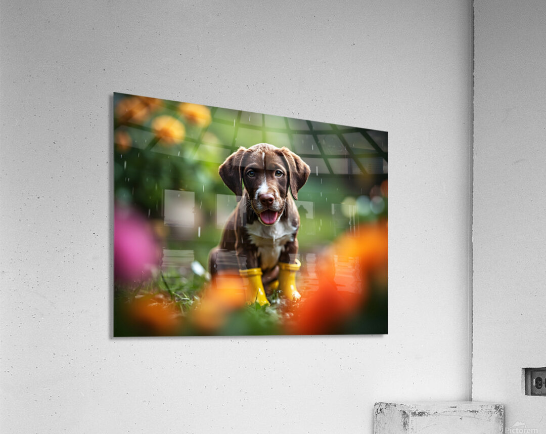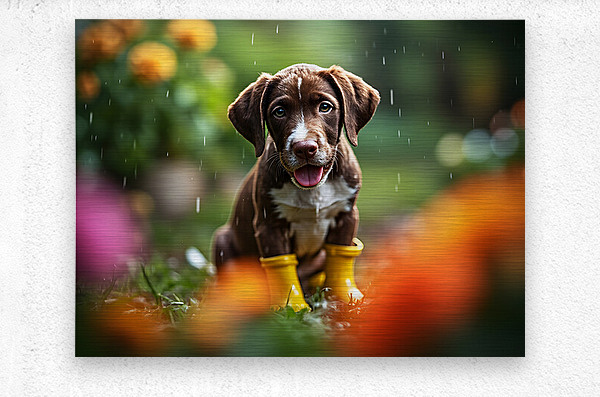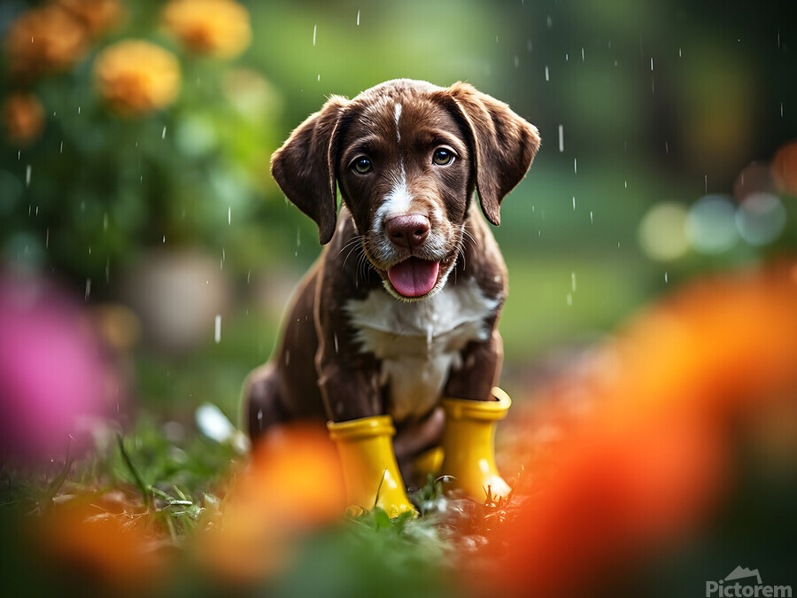 A content German Shorthaired Pointer puppy sits peacefully in the gentle rain wearing yellow rain boots brown and white coat dampened but spirits high surrounded by a soft-focus garden with colorful blooming flowers Digital Artwork.