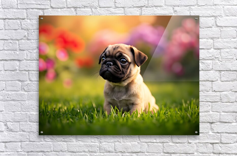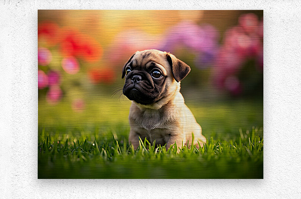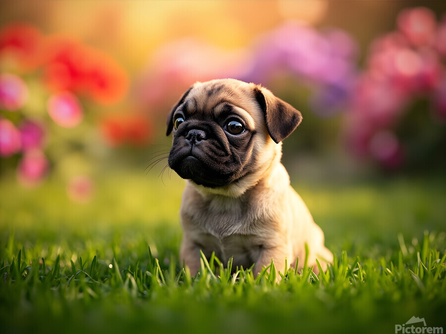 An adorable tan and black pug puppy sits on green grass with curious bright eyes looking upward. The wrinkled-faced puppy has characteristic floppy ears and appears eager and attentive in a garden setting with blurred flowers. Digital Artwork.