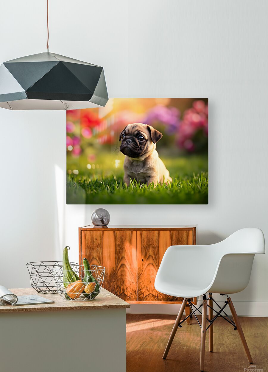 ABOUT THIS ARTWORK: PUG PUPPY DISCOVERS FUN GAME IN GARDEN