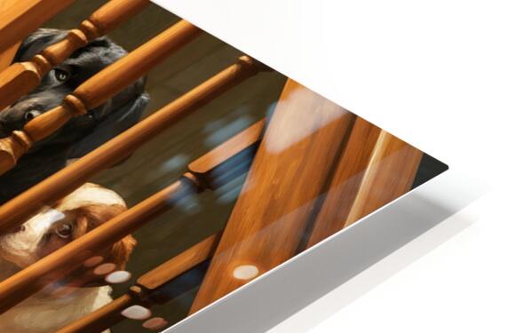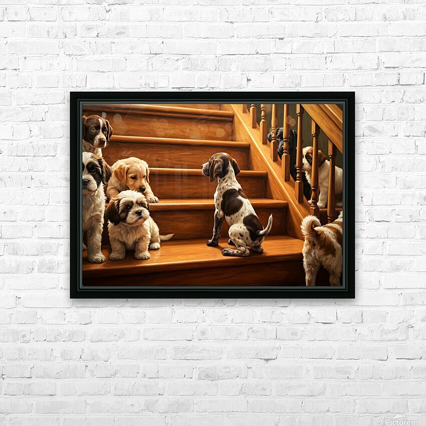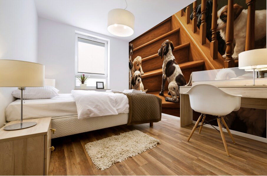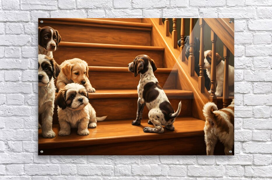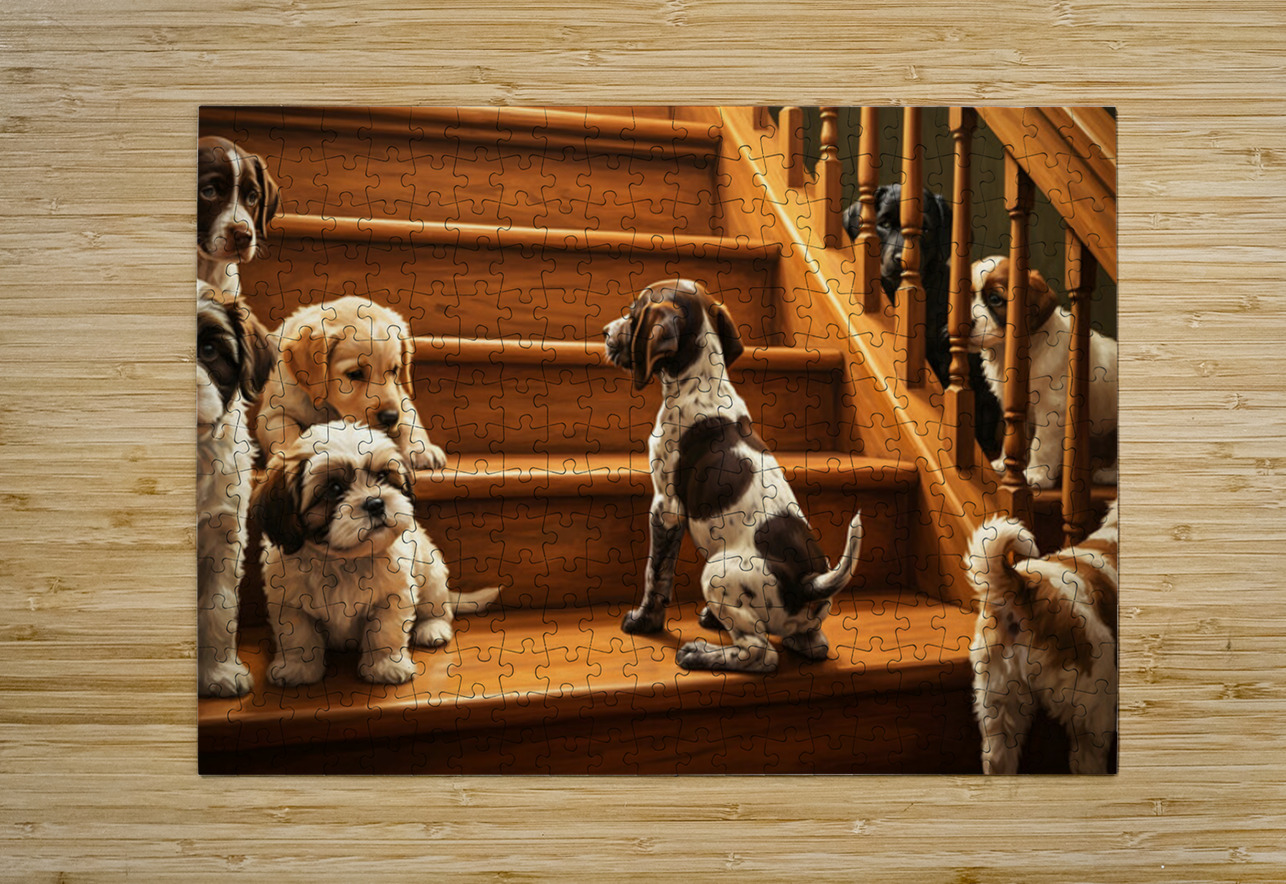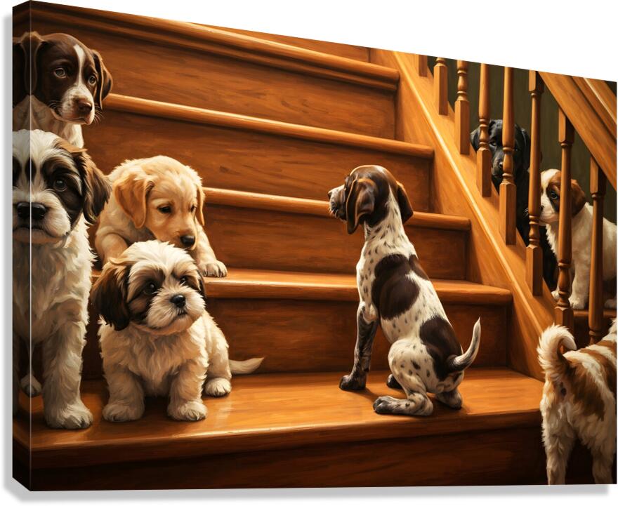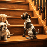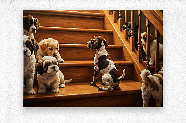 A determined brown and white spotted German Shorthaired Pointer puppy gazes upward at a tall wooden staircase while surrounded by other young puppies of various breeds at the bottom step. Digital Artwork.