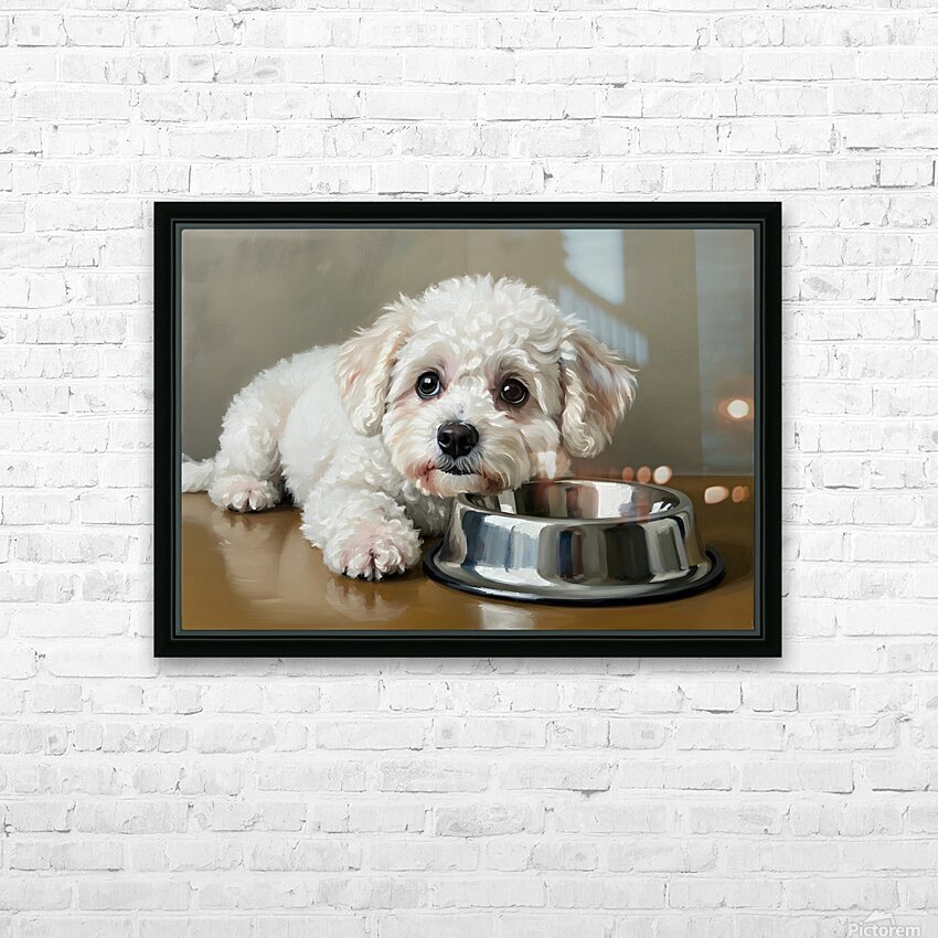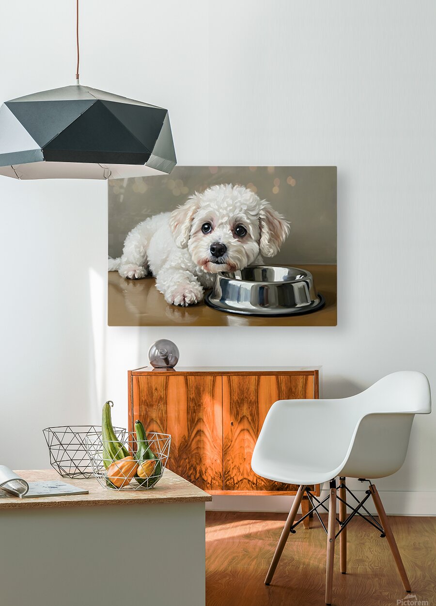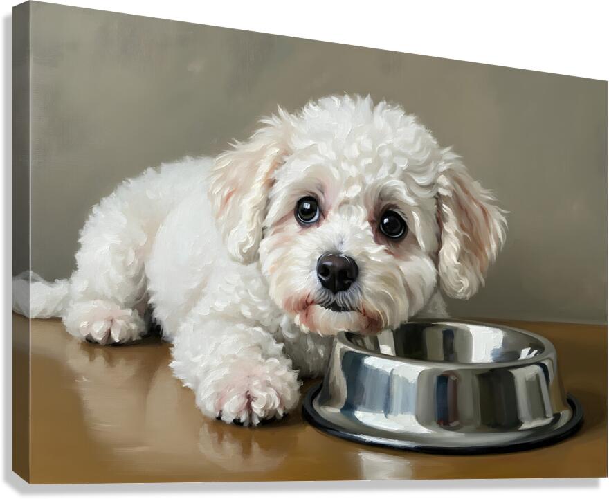 Get this artwork "Patient Bichon Frise Puppy Waits By Food Bowl" in a framed print.