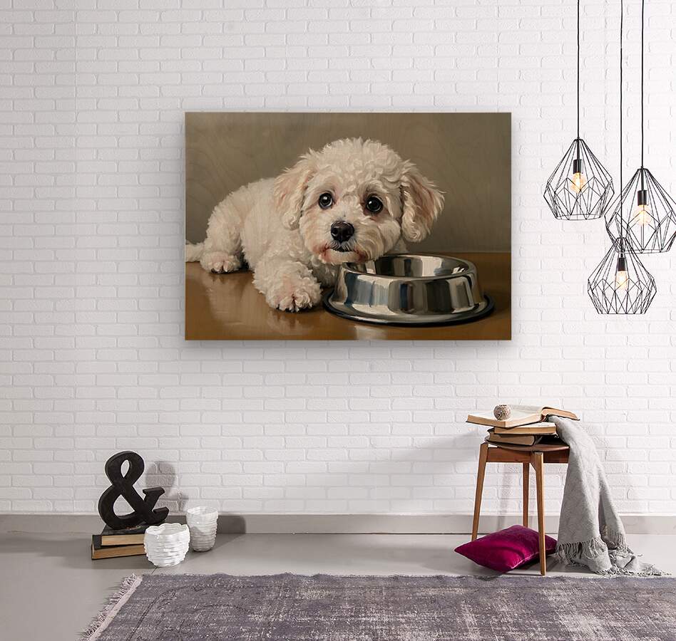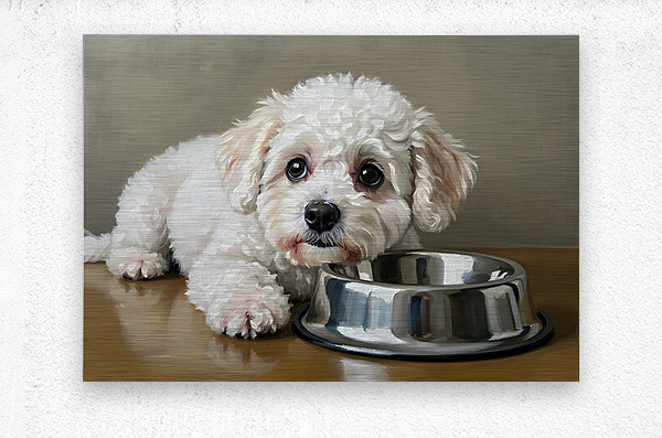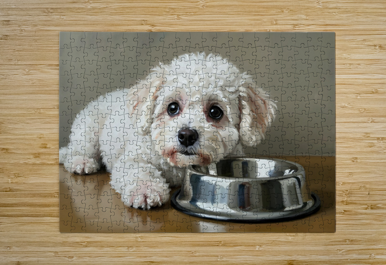 ABOUT THIS ARTWORK: PATIENT BICHON FRISE PUPPY WAITS BY FOOD BOWL