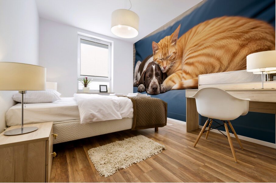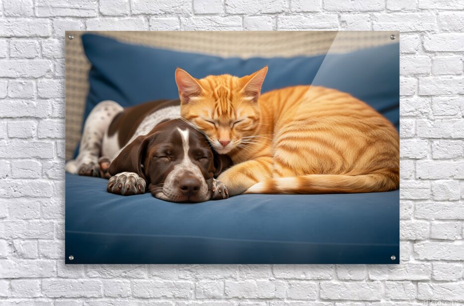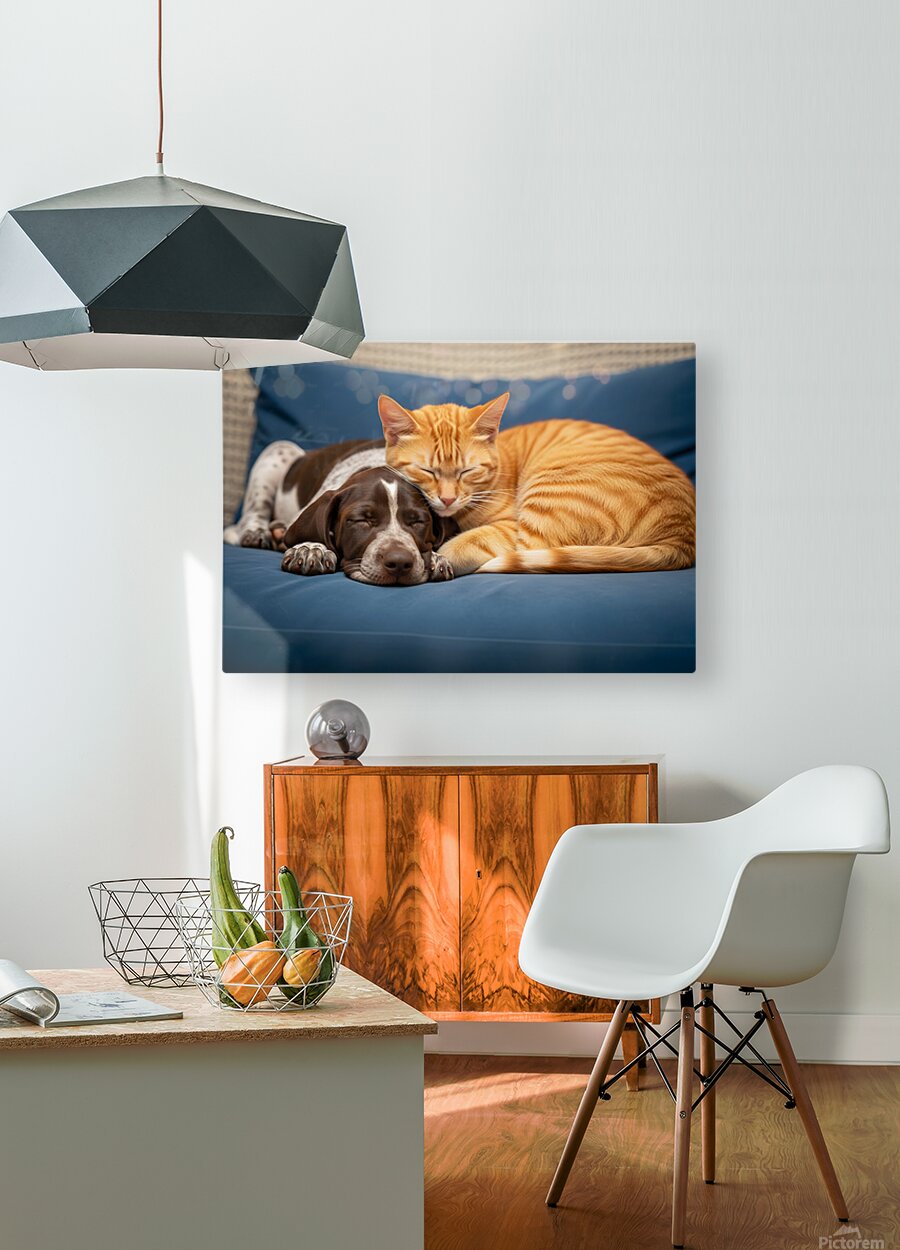 ABOUT THIS ARTWORK: PUPPY AND CAT SNUGGLE TOGETHER PEACEFULLY