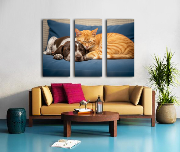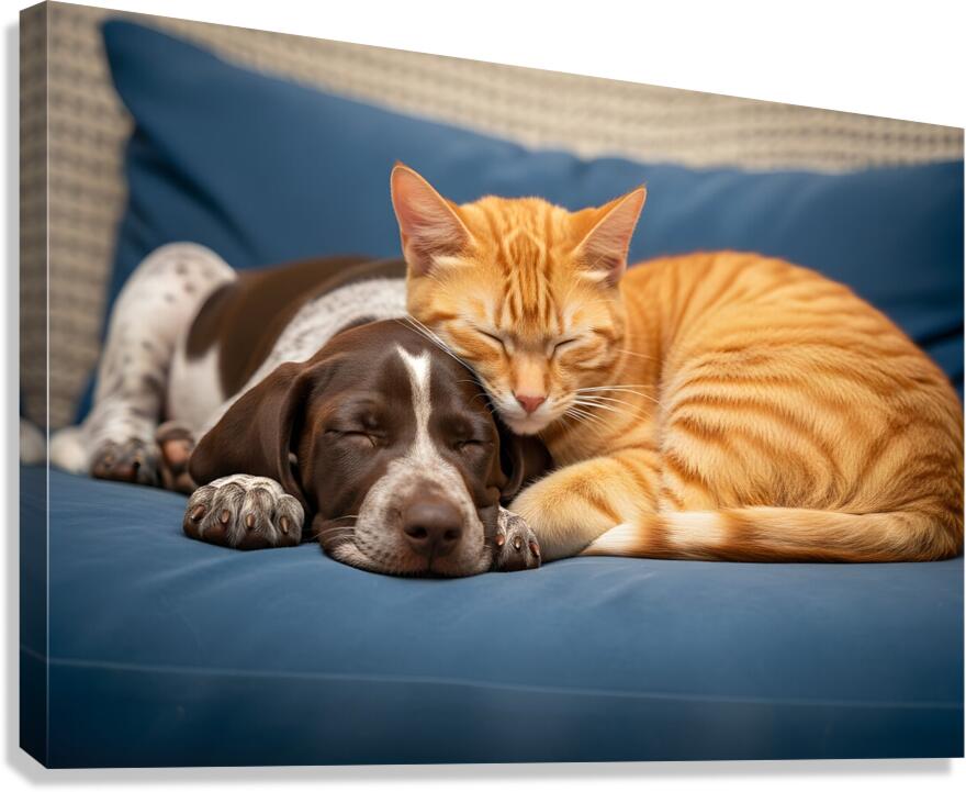 Puppy And Cat Snuggle Together Peacefully Canvas print