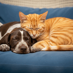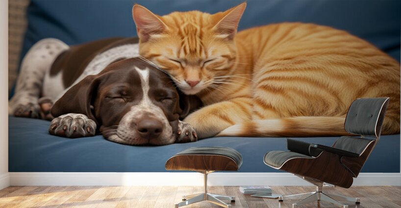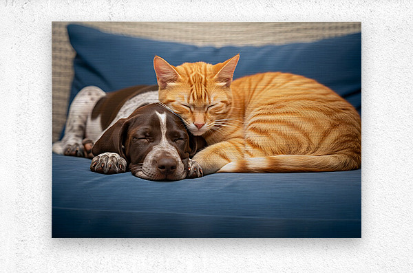 A German Shorthaired Pointer puppy with brown and white markings sleeps peacefully snuggled with an orange tabby cat on a blue cushion. Both animals have their eyes closed in comfortable slumber completely relaxed together. Digital Artwork.