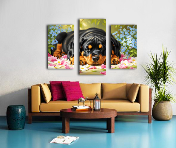 Sleepy Rottweiler Puppy Rests In Flower Bed Canvas print