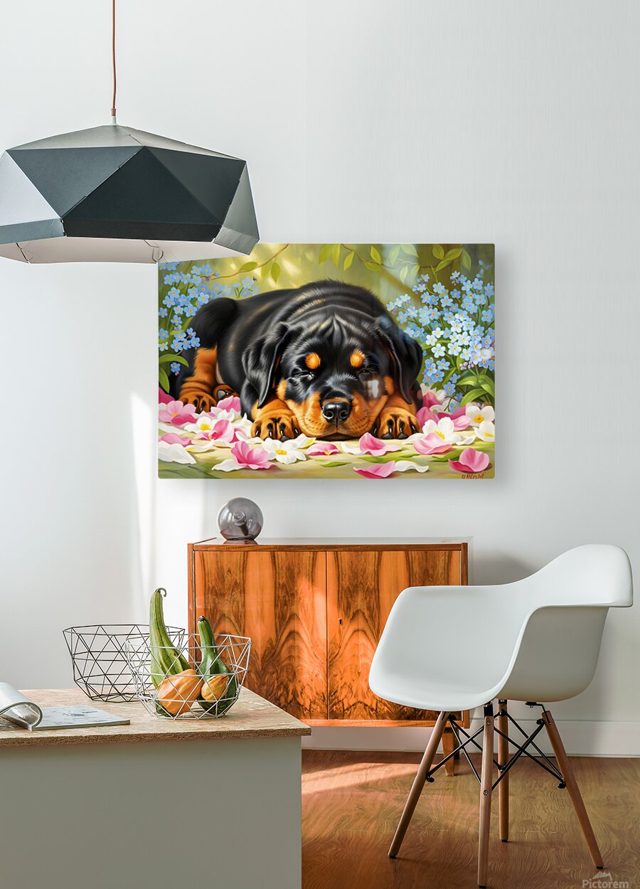 ABOUT THIS ARTWORK: SLEEPY ROTTWEILER PUPPY RESTS IN FLOWER BED