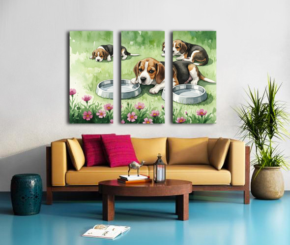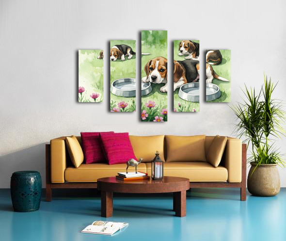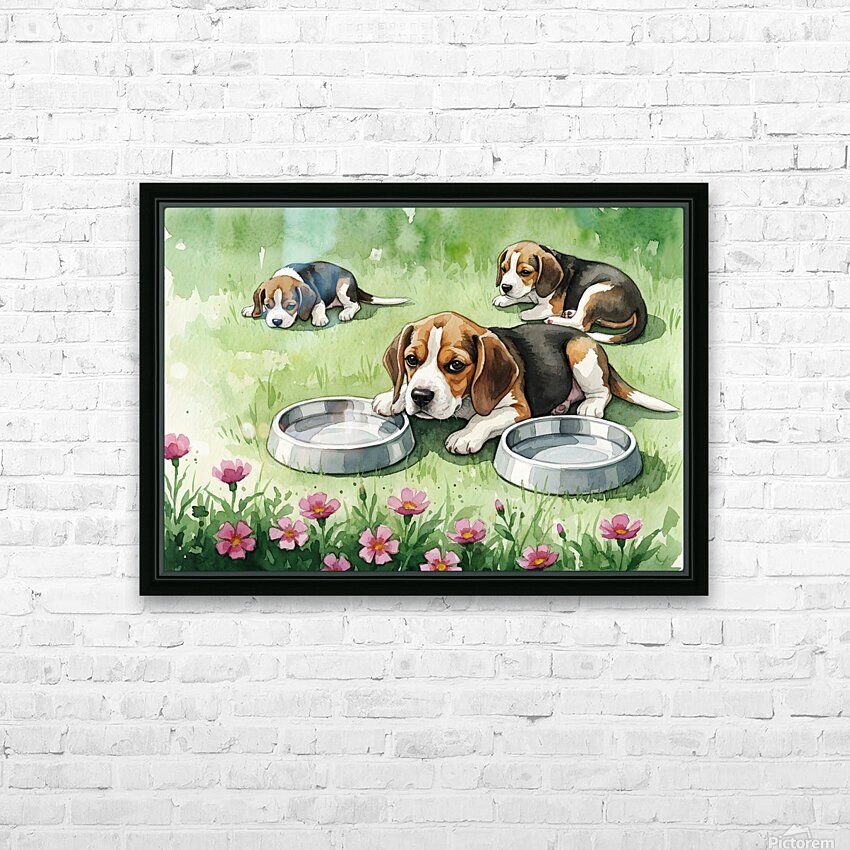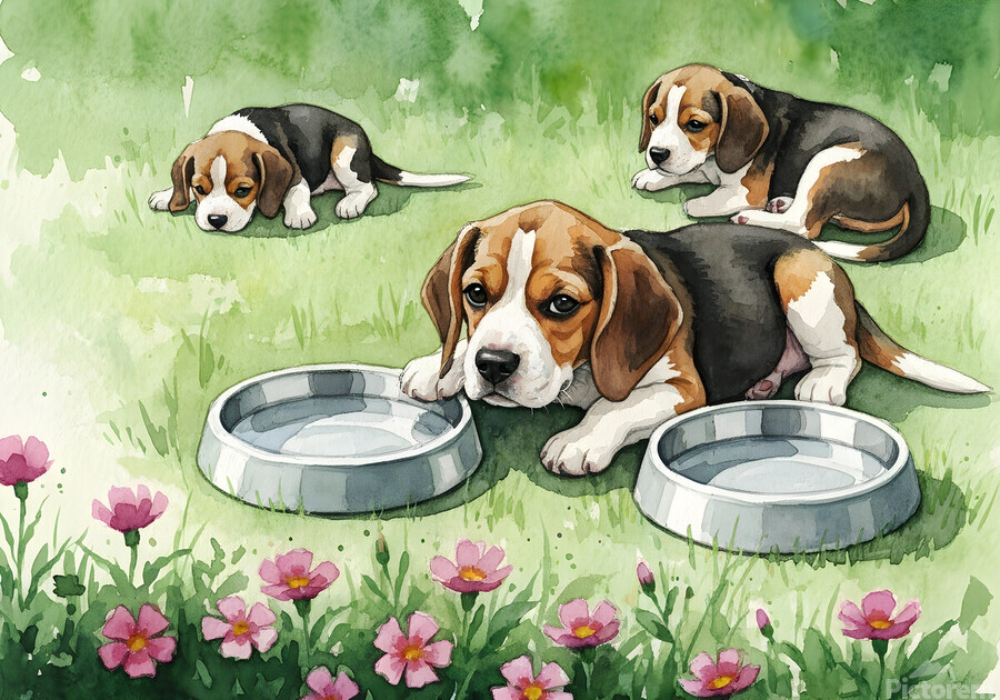 The brown and white beagle puppy sits contentedly near the water bowls with a satisfied expression and damp muzzle. Other tired puppies rest peacefully in the background while pretty garden flowers frame the scene. Digital Artwork.
