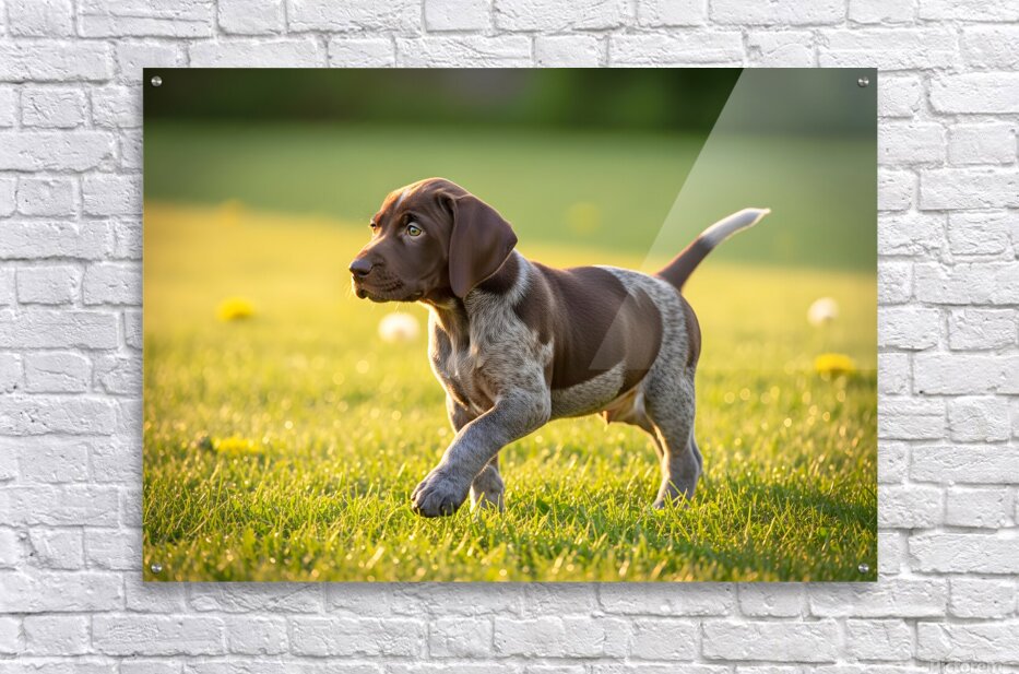 The proud German Shorthaired Pointer puppy walks across the green grass with growing confidence his brown and white coat gleaming in the sunlight as his tail wags enthusiastically with each successful step. Digital Artwork.
