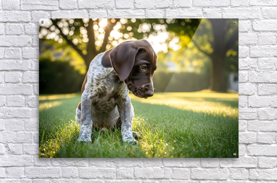 A young German Shorthaired Pointer puppy with distinctive brown and white markings sits on lush green grass examining his small paws with wide curious eyes as gentle morning light creates a warm glow around him. Digital Artwork.