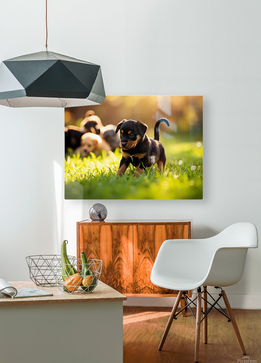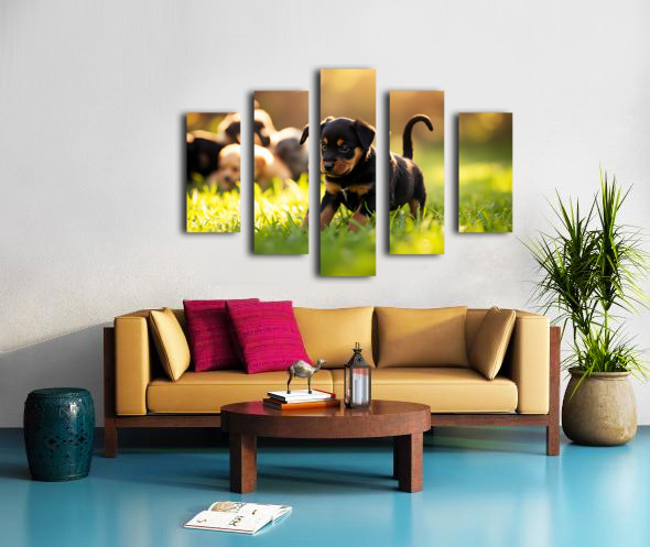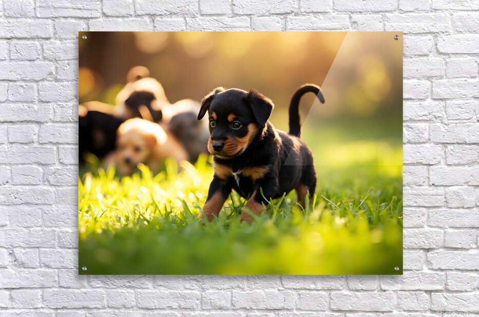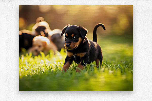 A young black and brown Rottweiler puppy assumes a classic play bow position on green grass with bright eyes and wagging tail showing excitement. Other puppies can be seen playing nearby in the outdoor setting. Digital Artwork.