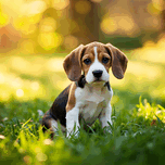 A curious young beagle puppy with distinctive tri-color markings sits on lush green grass in a bright backyard setting. The small dog appears confused...[+]
