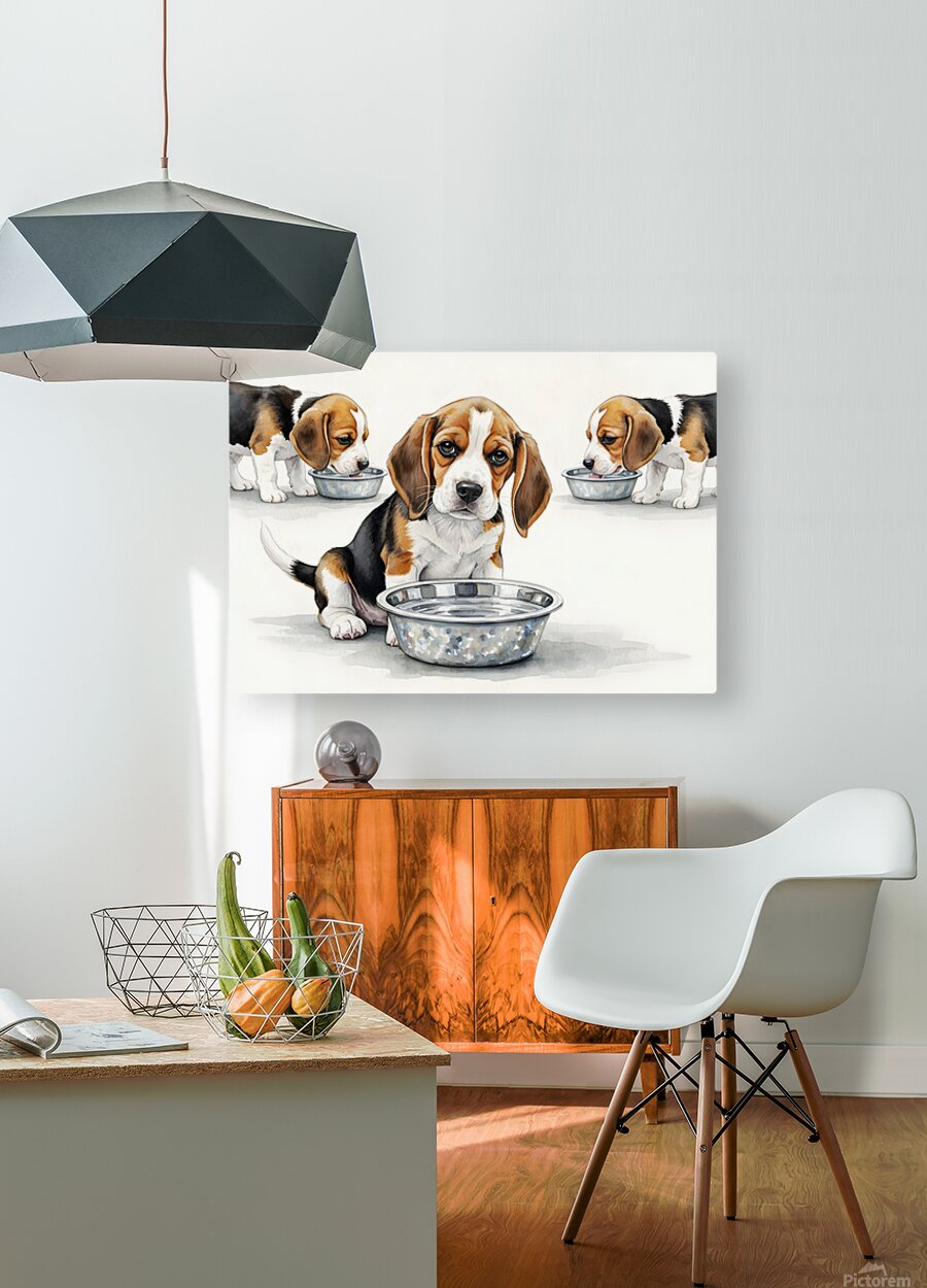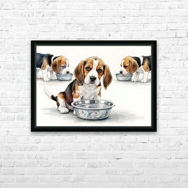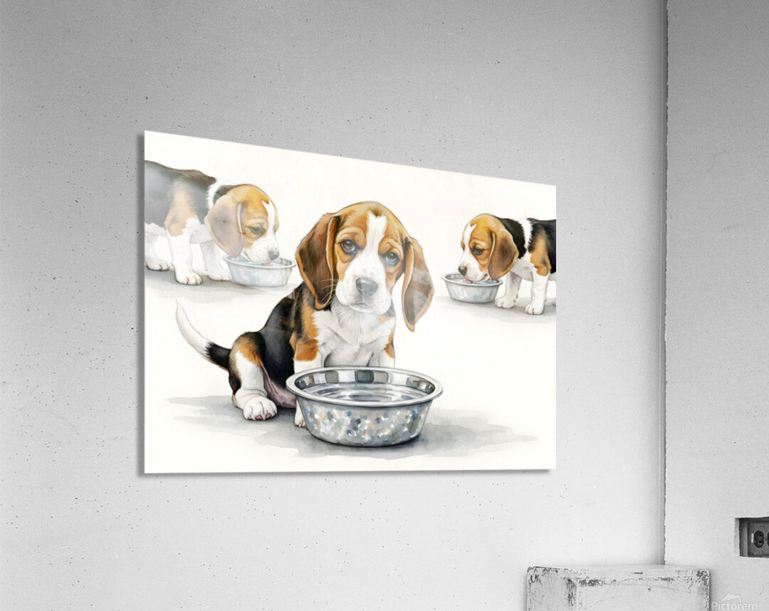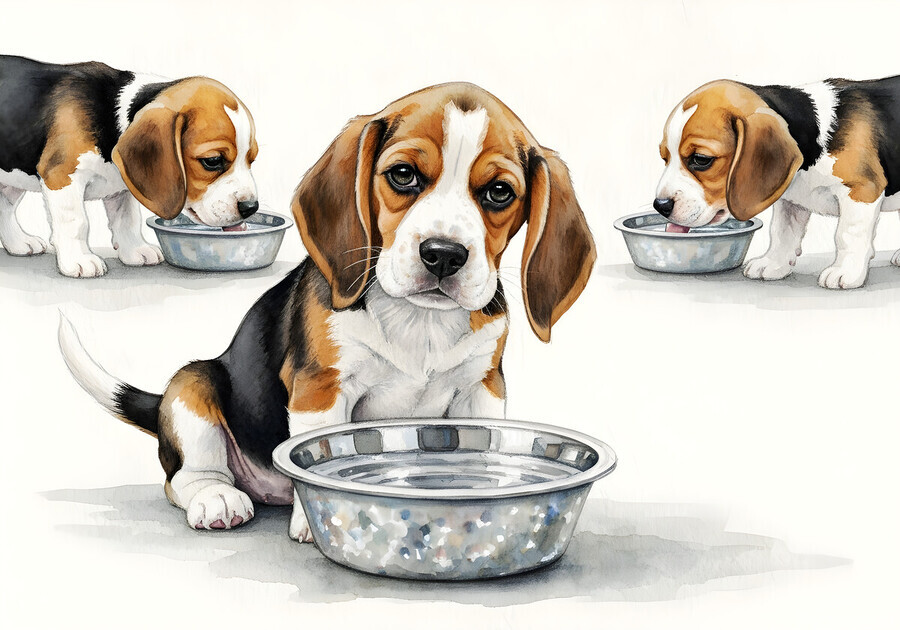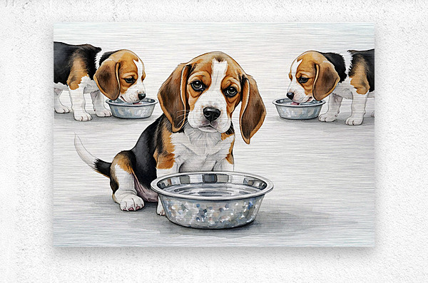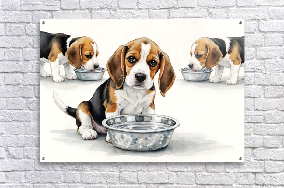 The brown and white beagle puppy sits back from the water bowl with a satisfied expression having quenched its thirst. Other beagle puppies with brown and white coats remain at the bowl drinking. Digital Artwork.