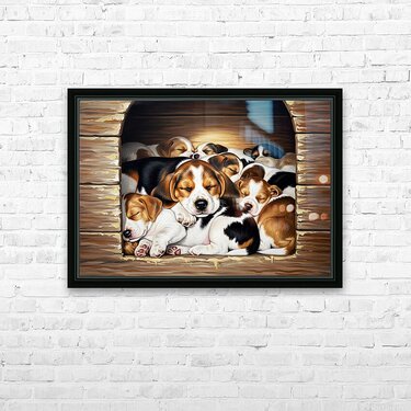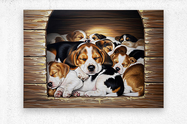 The brown and white beagle puppy sleeps soundly with closed eyes completely relaxed as part of a adorable puppy pile inside the doghouse. All the puppies are peacefully intertwined and resting together. Digital Artwork.