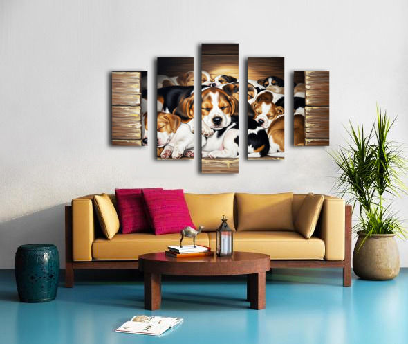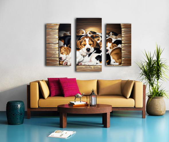 Beagle Puppy Sleeps Peacefully With Puppy Pile Canvas print