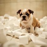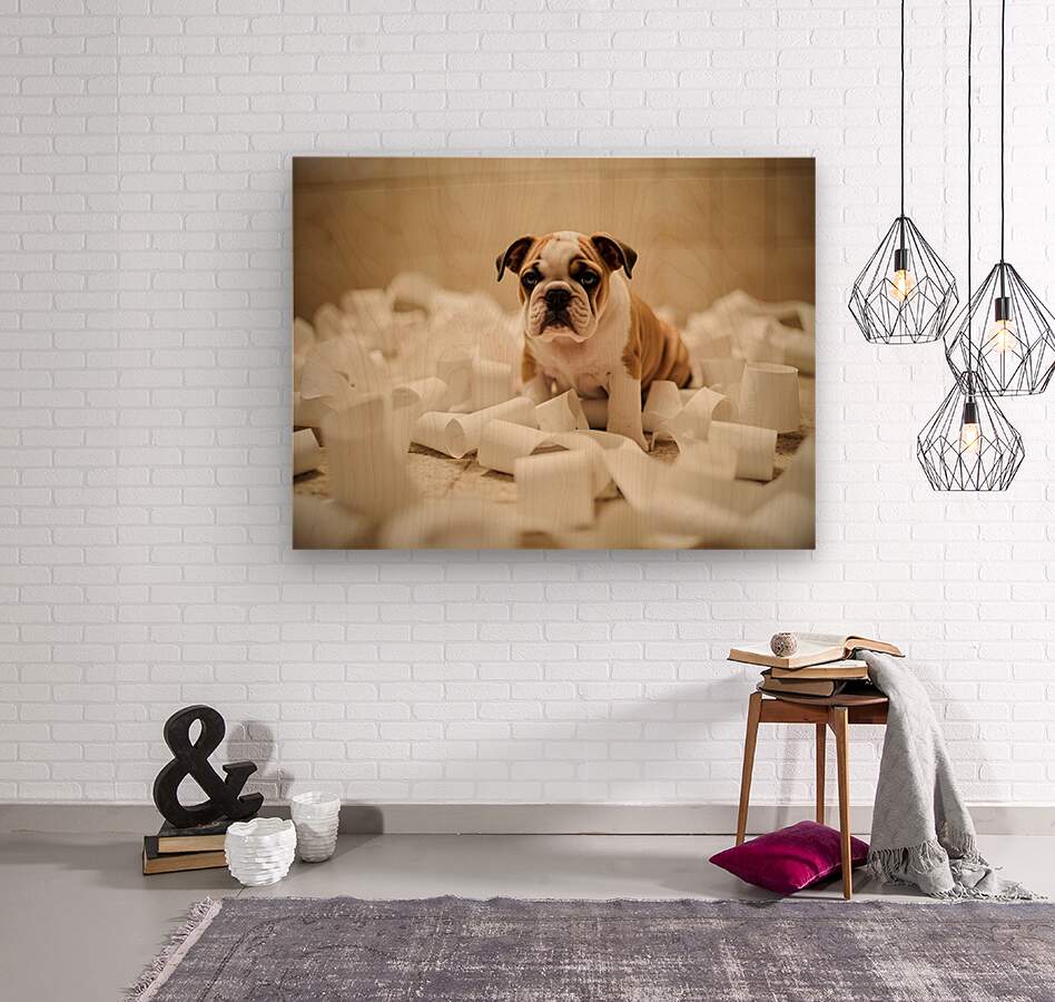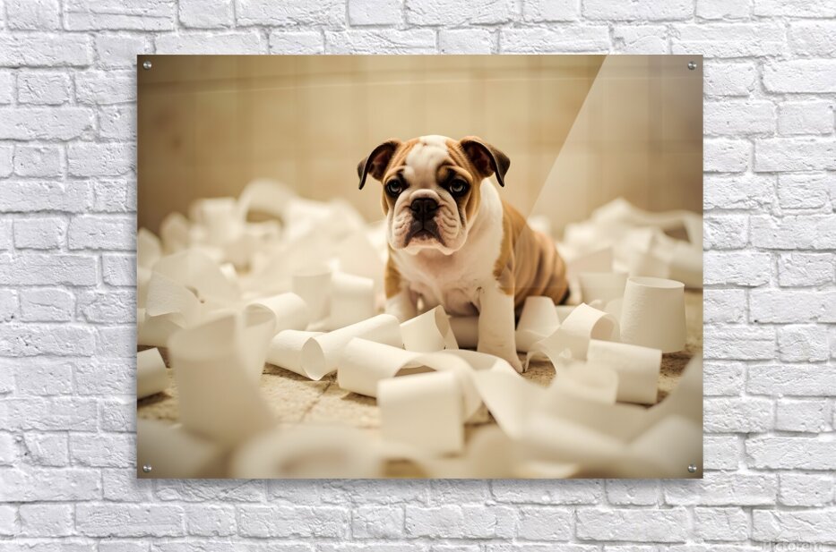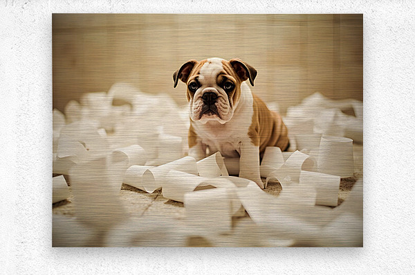 A cute brown and white bulldog puppy sits among scattered white toilet paper strips covering the bathroom floor. The puppy has droopy ears and a guilty expression with sad brown eyes surrounded by the mess he created. Digital Artwork.