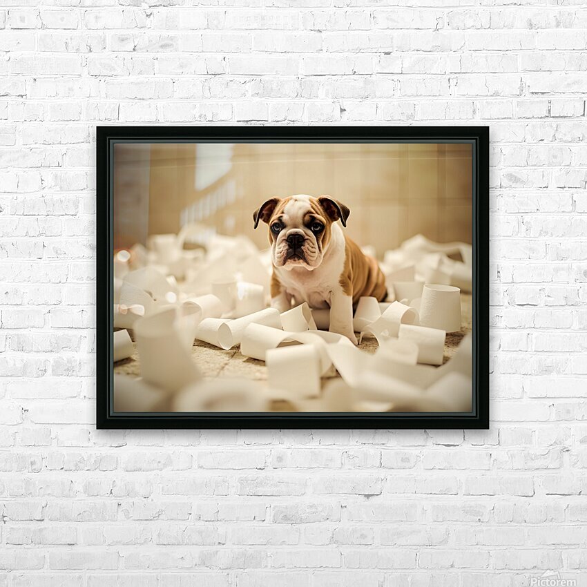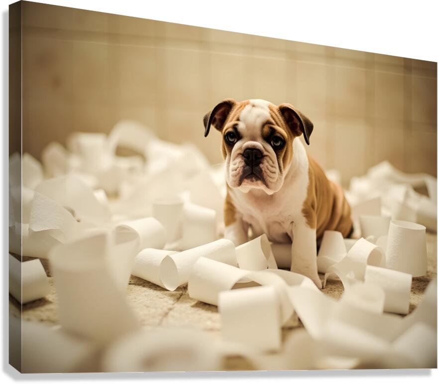 Get this artwork "Bulldog Puppys Toilet Paper Trouble Begins" in a framed print.