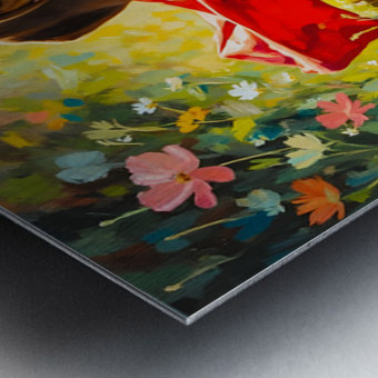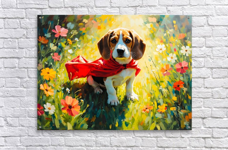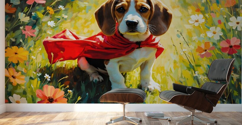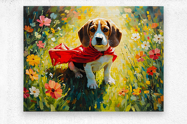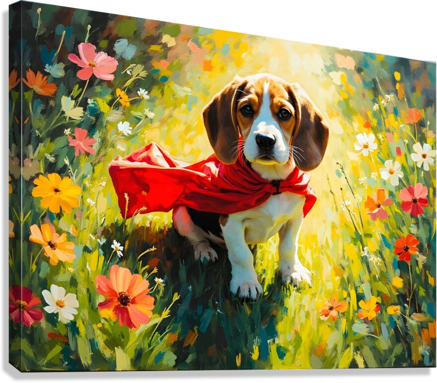 A cute beagle puppy with brown and white fur stands confidently wearing a vibrant red superhero cape in a sunny garden setting with colorful flowers softly blurred in the foreground Digital Artwork.