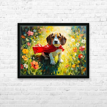 Get this artwork "Beagle Puppy Discovers His Magic Cape" in a framed print.