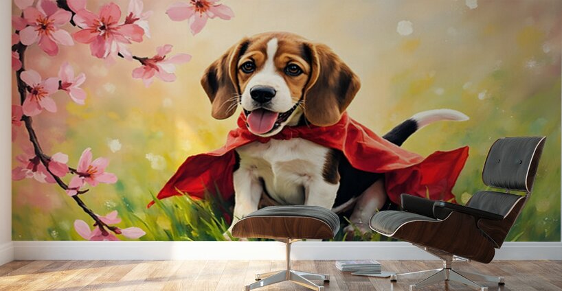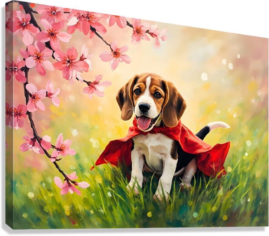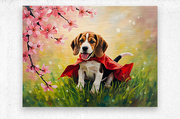 A happy beagle puppy with brown and white fur sits proudly wearing a bright red cape on green grass with soft pink blossoms blurred in the foreground creating a cheerful scene Digital Artwork.