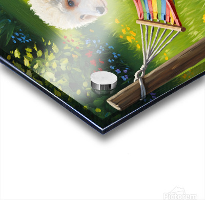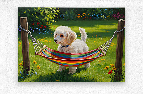 A cute white poodle puppy with fluffy curly coat stands on green grass looking up at a small colorful striped hammock suspended between wooden posts in a bright garden setting Digital Artwork.