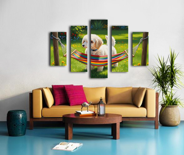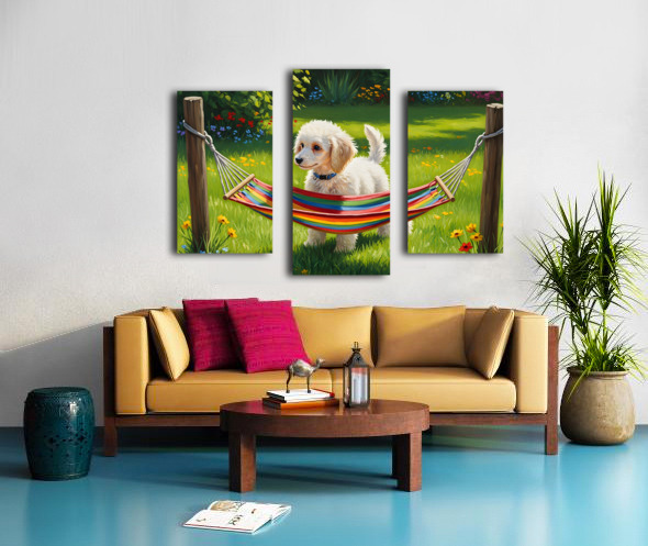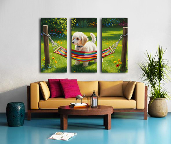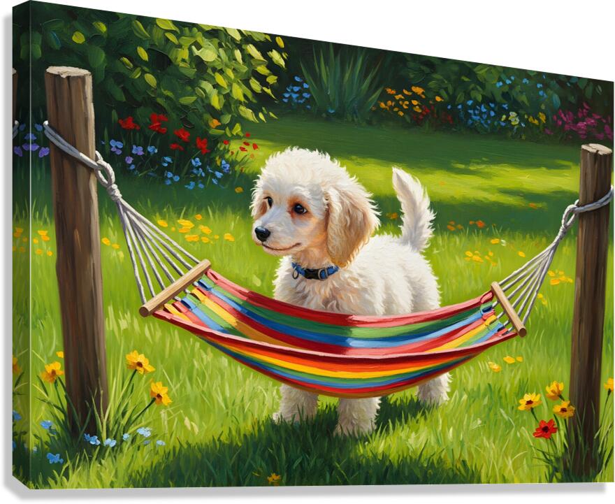 Poodle Puppy Discovers Tiny Hammock Canvas print