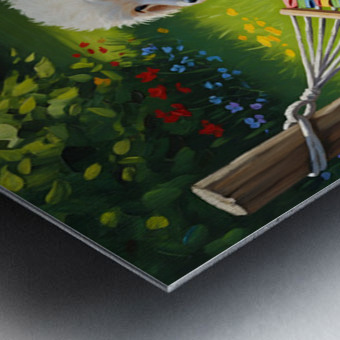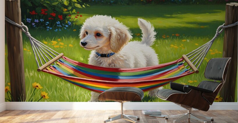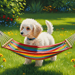A cute white poodle puppy with fluffy curly coat stands on green grass looking up at a small colorful striped hammock suspended between wooden posts in a bright garden setting Digital Artwork.