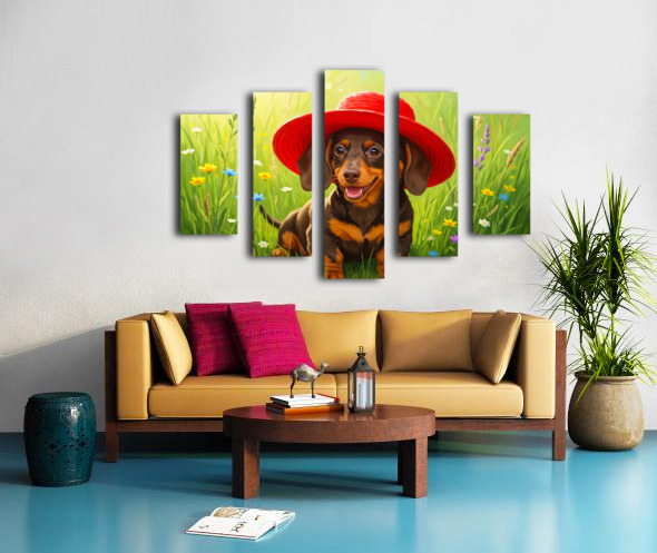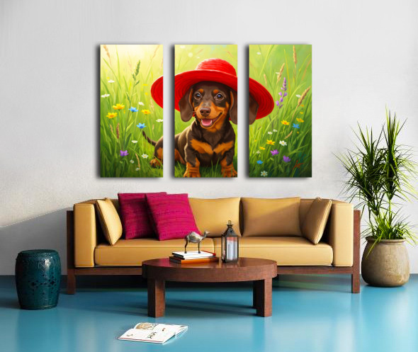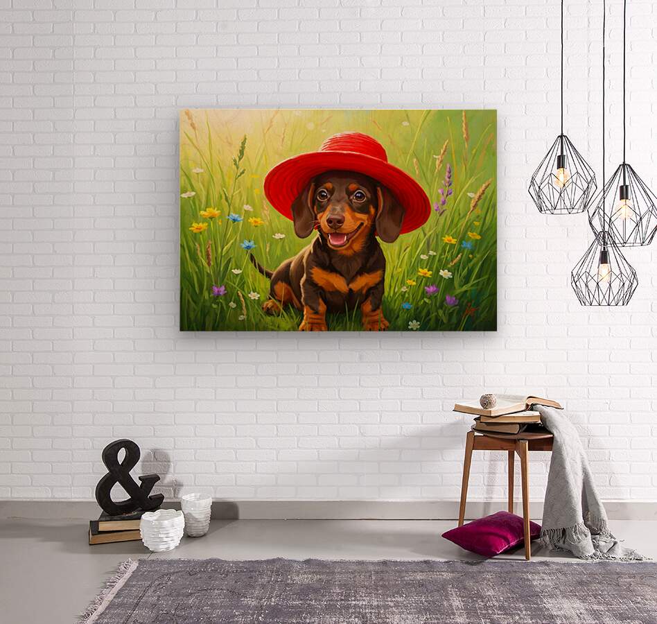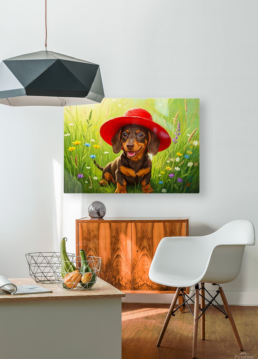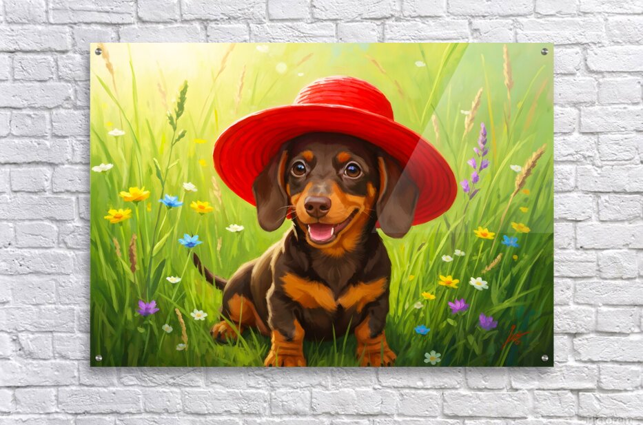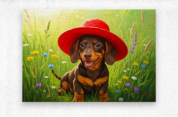 A tiny brown and tan dachshund puppy sits in lush green grass wearing an enormous bright red sun hat that dwarfs his small frame. The oversized hat tilts comically to one side as wildflowers bloom around him. Digital Artwork.