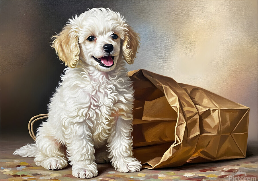 ABOUT THIS ARTWORK: TRIUMPHANT POODLE PUPPY COMPLETES PAPER BAG ADVENTURE