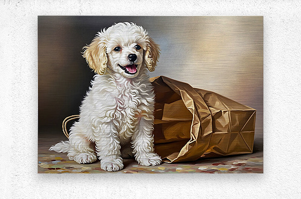 A small white poodle puppy with fluffy curly fur sits proudly beside an empty crumpled brown paper bag. The puppy displays a happy accomplished expression having successfully completed its brave adventure. Digital Artwork.