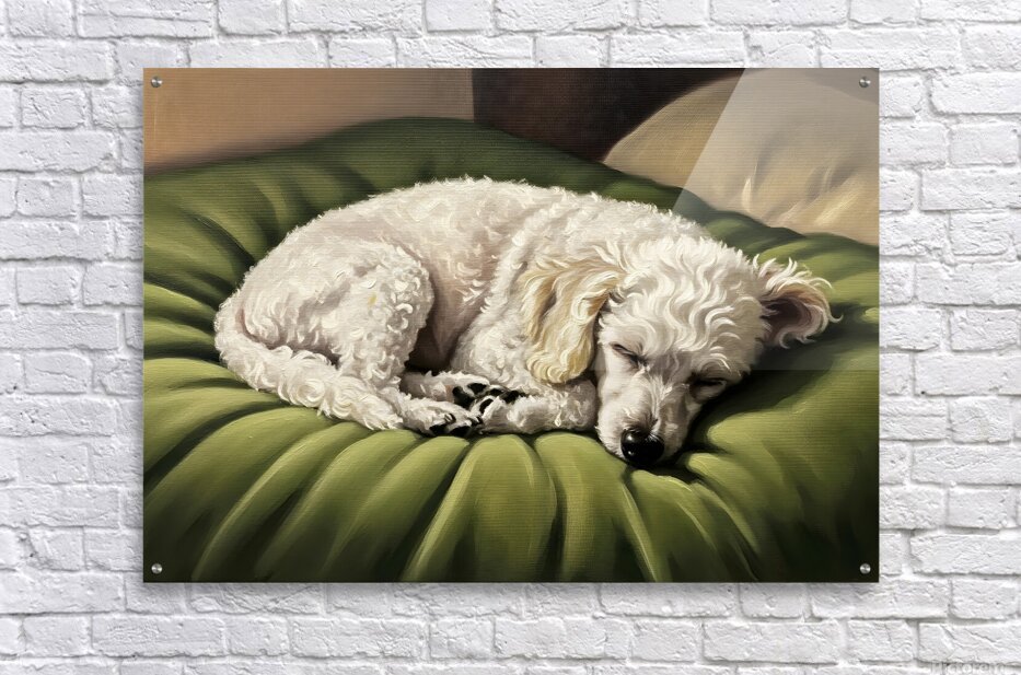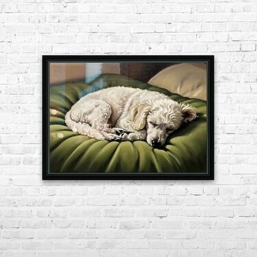 A white poodle puppy with curly fur sleeps soundly curled up in a ball on a green padded bed. The peaceful pup breathes gently with eyes closed in the quiet shadow-filled bedroom. Digital Artwork.