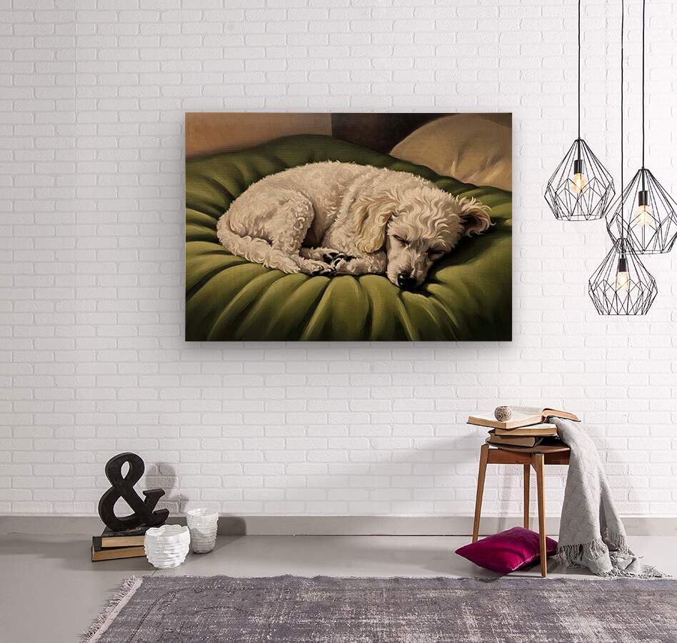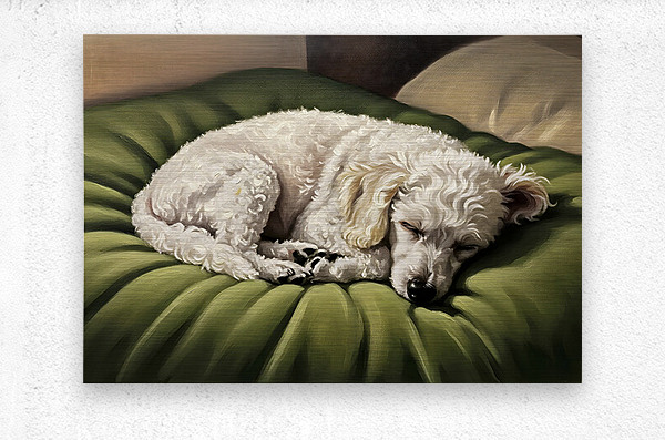 ABOUT THIS ARTWORK: POODLE PUPPY DREAMS ON GREEN PADDED BED