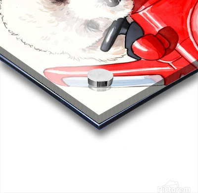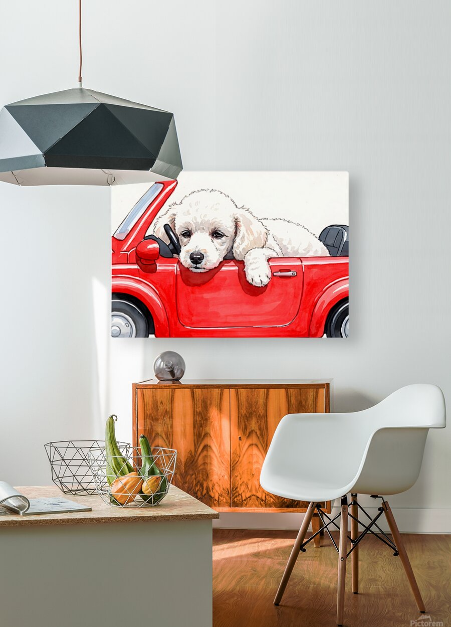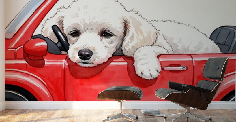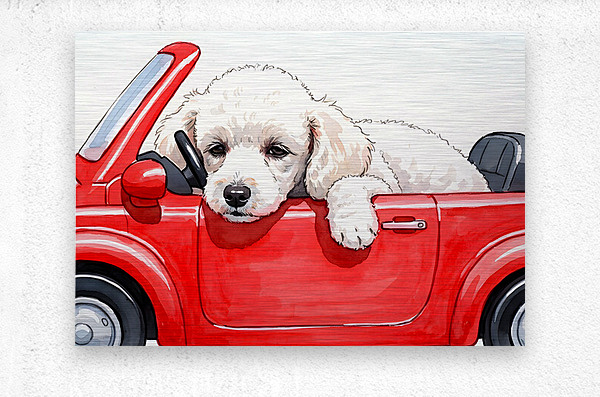The adventure winds down as the white poodle puppy settles into the red toy car with droopy sleepy eyes. Its fluffy head leans comfortably against the cars side showing peaceful contentment after an exciting pretend driving session. Digital Artwork.