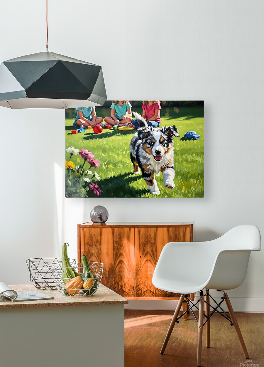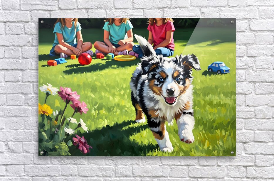 A beautiful blue merle Australian Shepherd puppy with striking blue eyes bounds eagerly across green grass toward a group of young children in a bright sunny backyard setting with toys nearby Digital Artwork.