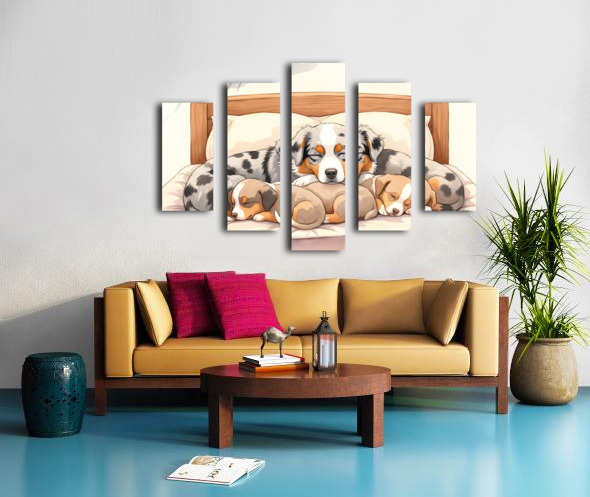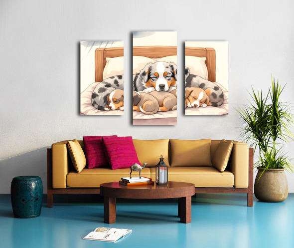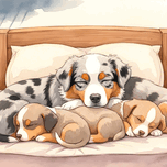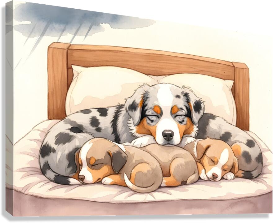 The blue merle Australian Shepherd puppy displays contentment with sleepy half-closed blue eyes as all siblings rest peacefully together. Warm lighting bathes the wooden bed where they sleep soundly after weathering the storm together. Digital Artwork.