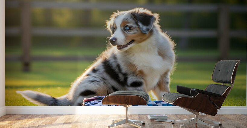 A small blue merle Australian Shepherd puppy with distinctive blue eyes sits beside an oversized rope toy in a bright backyard setting. The puppy appears excited and curious about the large plaything. Digital Artwork.
