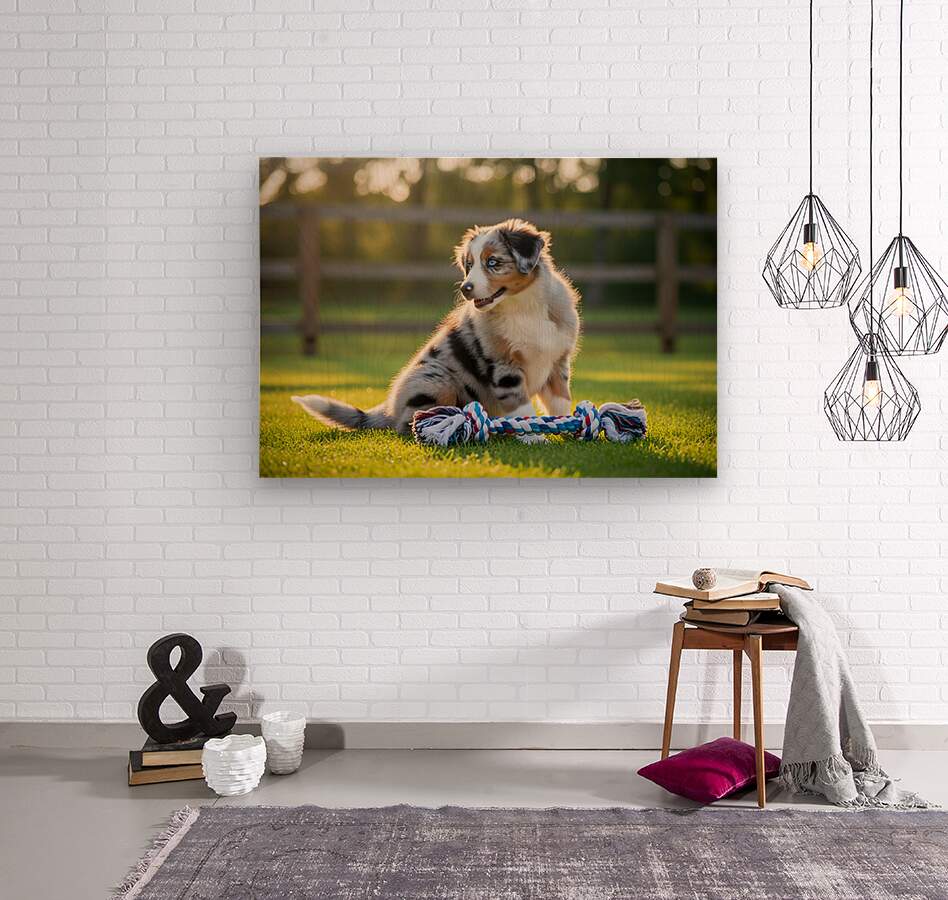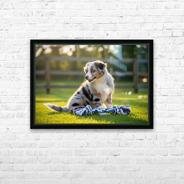 Australian Shepherd Puppy Discovers Big Chew Toy Picture Frame Printing