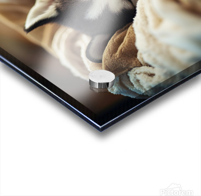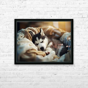 A peaceful gray and white Siberian Husky puppy sleeps contentedly curled up in a cozy nest created from clean towels and soft clothing Digital Artwork...[+]